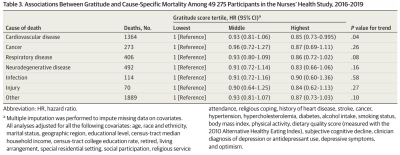 また、死因別に解析したところ、心血管疾患による死亡と感謝の気持ちは逆相関の関係にあり、高スコア群では低スコア群に比べて同死亡リスクが15%有意に低い(同0.85、0.73〜0.995)ことが分かりました。そのほかの死因(がん、呼吸器疾患、神経変性疾患、感染症、外傷、その他)でもリスク低下は認められましたが、統計学的に有意ではありませんでした。