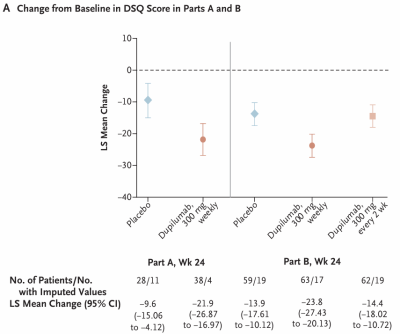 また、ベースラインの平均(±SD)DSQスコアは、パートAで33.6±12.41、パートBで36.7±11.22でした。24週時のDSQスコアのベースラインからの変化量(最小二乗平均変化量)は、パートAではデュピルマブ週1回群がプラセボ群と比較して有意に大きかった(-21.92 vs.-9.60、群間差:-12.32[95%CI:-19.11~-5.54]、p<0.001)ことが分かりました。パートBでも、デュピルマブ週1回群がプラセボ群と比較して有意に大きかったものの(-23.78 vs.-13.86、-9.92[-14.81~-5.02]、p<0.001)、デュピルマブ隔週群とプラセボ群との間に有意差は認められませんでした(-14.37 vs.-13.86、-0.51[-5.42~4.41]、p=0.84)。
