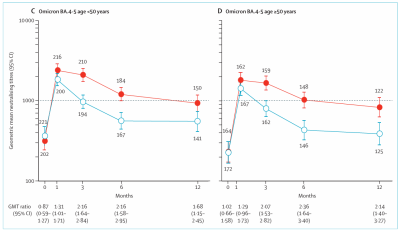 GMTは時間の経過とともに両群で低下したが、12ヵ月の追跡期間中に両群間の差は拡大し、<50歳ではGMT比がそれぞれ1.79(95%CI:1.41~2.29、武漢株)、1.68(1.15~2.45、オミクロン株BA.4/5)、≧50歳では2.06(1.55~2.75)、2.14(1.40~3.27)でした。