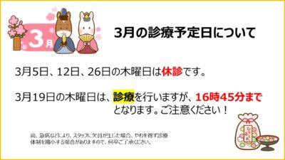 3月5日、12日、26日の木曜日は休診です。