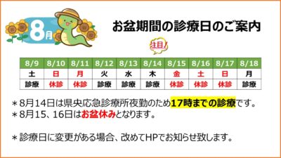 お盆期間の診療予定日は以下の通りです。 *診療日に変更がある場合、改めてHPでお知らせ致します。 *尚、急病などにより、スタッフに欠員が生じた場合、やむを得ず診療体制を縮小する場合があります。